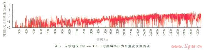 根據(jù)井壁穩(wěn)定性分析結(jié)果,深度小于2800m的地層當量應力低于地層巖石的綜合強度,氣體鉆井井壁穩(wěn)定性較好如圖2,而深度超過2800m的地層坍塌密度高于空氣鉆井臨界坍塌壓力當量密度值(圖3),這些層段‘營氣鉆井過程中存在垮塌掉塊,可通過優(yōu)化鉆井參數(shù)來克服,并做好氣液轉(zhuǎn)換準備;千佛崖組—須家河組地層氣體鉆井穩(wěn)定性較差,YB3井在自流井組3727.8~3791.5m應用氮氣鉆井,僅進尺63.7m,不但后期通井循環(huán)時間較長,鉆井費用也有所增加,在目前技術條件下該井段采用氣體鉆井還存在一定難度。