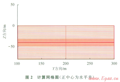 在Z軸方向(豎直方向),水合物層細(xì)分為Dz=0.2-1m的網(wǎng)格。而上下層在Z方向上,單個(gè)網(wǎng)格lm或2m,Z方向共離散成55個(gè)間隔。在Y方向(寬度方向),400m被分為3個(gè)網(wǎng)格,兩側(cè)網(wǎng)格均為l99.9m,中間網(wǎng)格為0.2m,用做開(kāi)采井。X方向?yàn)?span lang="EN-US">1m單個(gè)網(wǎng)格??偩W(wǎng)格數(shù)為l65(55×3)。最頂層和最底層的6(3×2)個(gè)網(wǎng)格作為邊界網(wǎng)格(恒溫、恒壓),離散所得的網(wǎng)格如圖2所示。開(kāi)采井在網(wǎng)格正中心,圖3為井的放大圖,圖3中示意了流體流向。井內(nèi)溫度壓力條件根據(jù)模擬需要進(jìn)行相應(yīng)設(shè)置。井溫度設(shè)定為42℃(恒溫),壓力設(shè)置為0.2P0、0.5P0、0.8P0 (恒壓)3個(gè)級(jí)別進(jìn)行模擬開(kāi)采。