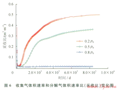如果水合物已經(jīng)分解,分解氣體不能夠流入井內(nèi)被順利收集,那么這種技術(shù)就沒(méi)有任何經(jīng)濟(jì)價(jià)值和意義。因此井中的流體流動(dòng)對(duì)水合物的開(kāi)采是非常重要的。圖6為3種開(kāi)采條件下,井內(nèi)收集氣體積速率和水合物分解氣的體積速率比(采收比)隨時(shí)間的變化圖。在開(kāi)采初期,水合物分解速率大,分解氣體積速率也大,而井內(nèi)收集速率較小,所以采收都比較低。而在開(kāi)采后期,分解氣體積速率小,收集速率比較平穩(wěn),所以開(kāi)采后期采收比根據(jù)井和物藏間壓差不同而變化較大。在0.2P0、42℃情況下,采收比在開(kāi)采1000d左右增加到0.3,而0.5P0、42℃情況下,則在2000d左右才達(dá)到0.3,而0.8P0、42℃條件下,采收比始終接近于0。水合物藏總含氣量為6.8×105m3,0.2P0、42℃條件下,井內(nèi)氣體累積收集量為3.4×l05 m3,總采收率為0.5。當(dāng)氣體收集到2.1×105m3,總的采收率約為0.3,0.8P0,42℃條件下,總采收比接近0。由此可以看出,減壓驅(qū)動(dòng)力對(duì)采收比也有著非常大的影響。