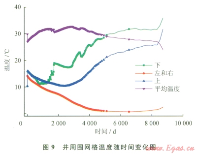 從圖9中可以看出,8500d內(nèi),井和周?chē)W(wǎng)格溫差平均值為30.3℃。因?yàn)樽笥揖W(wǎng)格中心和井網(wǎng)購(gòu)中心距離大,井對(duì)左、右網(wǎng)格的導(dǎo)熱熱流忽略不計(jì)。只考慮上、下網(wǎng)格,導(dǎo)熱距離0.35m。骨架有效導(dǎo)熱系數(shù)為1.86W/(m·K),水的有效導(dǎo)熱系數(shù)為0.12W/(m·K)。由式(4),骨架導(dǎo)熱功率64.4W,水導(dǎo)熱功率4.1W,所以總的導(dǎo)熱熱流為68.5W。