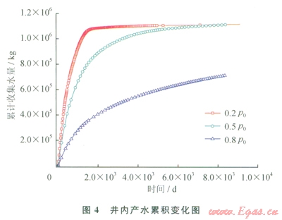 從上述研究成果町以得出,在0.2p0條件下,水合物藏中水合物全部分解,井內(nèi)收集到3.4×105m3的氣體。圖4為0.2p0、42℃,0.5p0、42℃,0.8p0、42℃這3種條件下,井內(nèi)收集水的累積變化圖。從圖4中可以看出,產(chǎn)水集中在開(kāi)采前期1500d,后期產(chǎn)水速率小。在0.5p0、42℃,0.8p0、42℃條件下,也有較大量的水被收集,表明也有較大量的水合物被分解了。圖5為整個(gè)開(kāi)采過(guò)程中3種條件下,井內(nèi)氣水比隨時(shí)間的變化圖。從圖5可以看出,0.2p0、42℃條件下,氣水比一直在增加,最大值達(dá)到304;而0.5p0、42℃條件下,氣水比增加緩慢,最大達(dá)到136;0.8p0、42℃條件下氣水體積比一直接近0,開(kāi)采后期也沒(méi)有改善。可以看出,在井內(nèi)壓力高時(shí),井和物藏間的壓差不夠大,整個(gè)開(kāi)采過(guò)程,分解后的自由氣并沒(méi)有大量流人開(kāi)采井內(nèi)??梢?jiàn)減壓驅(qū)動(dòng)力對(duì)于分解后自由氣在井內(nèi)的收集非常重要。物藏和井之間壓差太小,自由氣一直留在物藏內(nèi),無(wú)法在井內(nèi)被收集。