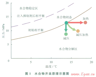 井的高溫和低壓條件將促使水合物分解。同時(shí),多孔介質(zhì)中的水合物的分解將提高物藏的流動(dòng)性,進(jìn)而促進(jìn)降壓和加熱驅(qū)動(dòng)力分解水合物的效果,使得水合物藏進(jìn)一步分解,從而形成良性循環(huán)。這樣將使更多的水合物分解,最終達(dá)到開(kāi)采目的。