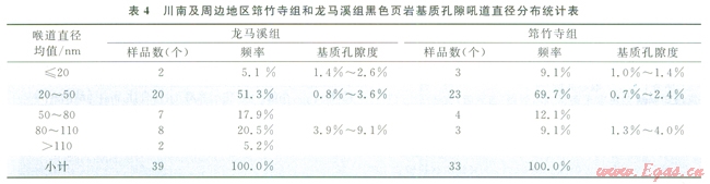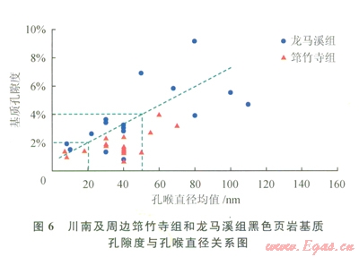 筇竹寺組頁(yè)巖樣品孔喉直徑均值一般介于7~105nm,樣品孔喉直徑分布頻率為低于20nm的樣品占9.1%,20~50nm的樣品占69.7%,50~80nm的樣品占12.1%,80~110nm的樣品占9.1%,即直徑小于50nm的中小孔隙占78.8%,直徑大于50nm的大孔隙僅占21.2%。龍馬溪組頁(yè)巖孔喉直徑均值一般介于8~160nm,樣品孔喉直徑分布頻率為低于20nm的樣品占5.1%,20~50nm的樣品占51.3%,50~80nm的樣品占l7.9%,80~110nm的樣品占20.5%,大于ll0nm的樣品占5.1%,即直徑小于50nm的中小孔隙占56.4%,直徑大于50nm的大孔隙占43.6%(為筇竹寺組的2倍)。兩套海相頁(yè)巖基質(zhì)孔隙度與孔喉直徑均值都具有較好的正相關(guān)性(圖6),孔喉直徑均值為50nm以上、20~50nm和20nm以下的樣品分別具有2.7%~6.9%(平均為4.9%)、0.7%~3.6%(平均為2.1%)和1.0%~l.9%(平均為1.4%)的基質(zhì)孔隙度。這表明,要形成孔隙度在2%以上的有效頁(yè)巖儲(chǔ)層,孔喉直徑均值一般需要超過(guò)20nm;要形成孔隙度超過(guò)4%的優(yōu)質(zhì)頁(yè)巖儲(chǔ)層,孔喉直徑均值需達(dá)到50nm以上??梢?jiàn),在頁(yè)巖納米級(jí)孔隙系統(tǒng)中,對(duì)基質(zhì)孔隙度貢獻(xiàn)最突出的是孔徑超過(guò)50nm的大孔隙,其次是孔徑介于20~50nm的中孔,而貢獻(xiàn)最小的是孔徑低于20nm的微小孔(對(duì)應(yīng)的孔隙度一般低于2%);筇竹寺組頁(yè)巖以孔徑低于50nm的中小型孔隙為主,而孔徑超過(guò)50nm的大孔隙明最少于龍馬溪組,這是導(dǎo)致該頁(yè)巖基質(zhì)孔隙度明顯減少并低于龍馬溪組的重要原因之一。