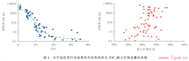 根據(jù)頁(yè)巖三層巖石物理模型[11],筇竹寺組、龍馬溪組等海相頁(yè)巖由脆性礦物、黏土層和有機(jī)質(zhì)等導(dǎo)電性差異極大的3類(lèi)物質(zhì)組成。脆性礦物層由石英、長(zhǎng)石、方解石、白云石、黃鐵礦等物質(zhì)組成,孔隙極少,一般認(rèn)為只有黃鐵礦具有導(dǎo)電性,但黃鐵礦因質(zhì)量百分含量一般低于l0%且主要呈星點(diǎn)狀分布,因此對(duì)頁(yè)巖的導(dǎo)電性貢獻(xiàn)不大。黏土礦物主要由蒙脫石、伊蒙混層、伊利石、綠泥石等具有附加導(dǎo)電性的物質(zhì)組成,是形成碎屑巖低阻油氣層的主要介質(zhì)之一[23]。有機(jī)質(zhì)層一般不導(dǎo)電,但在極高成熟 變生階段因出現(xiàn)碳化現(xiàn)象則具有較強(qiáng)的導(dǎo)電性。根據(jù)Barnett頁(yè)巖和我國(guó)東西部低阻油氣層電性特征,細(xì)粒碎屑巖的導(dǎo)電性主要為泥質(zhì)/黏土礦物所控制,處于有效生烴窗內(nèi)的有機(jī)質(zhì)和烴類(lèi)泥頁(yè)巖一般不導(dǎo)電。因此黑色頁(yè)巖電阻率一般隨著泥質(zhì)/黏土礦物增加而降低,隨有機(jī)質(zhì)豐度增加而升高[10,12,23],例如:渤海灣地區(qū)古近系一新近系砂泥巖低阻油氣層一般含有20%~65%黏土礦物,其電阻率大多為5~20W·m,且隨著黏土礦物含量增加而降低[23];川南龍馬溪組頁(yè)巖電阻率一般為8~40W·m,且總體隨著有機(jī)質(zhì)豐度增加而升高[10]。