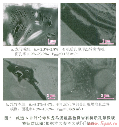 碳化不僅導(dǎo)致有機(jī)質(zhì)產(chǎn)氣能力降低,微觀結(jié)構(gòu)改變,導(dǎo)電性變強(qiáng),而且對(duì)有機(jī)質(zhì)孔隙發(fā)育也會(huì)產(chǎn)生影響。鄒才能、董大忠、李新景等通過(guò)對(duì)威遠(yuǎn)地區(qū)筇竹寺組(R。介于3.2%~3.6%)和龍馬溪組(R。介于2.3%~2.8%)頁(yè)巖樣品開(kāi)展高倍電鏡(氬離子拋光處理后)觀察發(fā)現(xiàn),在相近尺度(比例尺刻度值為1mm)的電鏡資料中,筇竹寺組頁(yè)巖有機(jī)質(zhì)孔隙發(fā)育程度較龍馬溪組頁(yè)巖差(圖5),主要表現(xiàn)為:受有機(jī)質(zhì)碳化影響,筇竹寺組有機(jī)質(zhì)孔隙出現(xiàn)明顯的塌陷和充填現(xiàn)象,邊界模糊不清或呈弧形,孔徑變小,其中大量直徑小于40nm的孔隙因完全充填而基本消失(圖5-b右),進(jìn)而導(dǎo)致有機(jī)質(zhì)內(nèi)微孔隙體積大幅度減少,測(cè)試面孔率僅4.6%~l0.6%(圖5-b);相反,龍馬溪組頁(yè)巖有機(jī)質(zhì)孔隙不僅數(shù)量多,且形態(tài)輪廓清晰(多呈菱形或多邊形),較少出現(xiàn)充填現(xiàn)象,測(cè)試面孔率為ll.9%~23.9%(圖5-a)。鏡下分析表明,受有機(jī)質(zhì)碳化影響,筇竹寺組頁(yè)巖有機(jī)質(zhì)產(chǎn)生的微孔隙體積明顯比龍馬溪組少,這與前面的計(jì)算結(jié)果(筇竹寺組的VTOC僅為龍馬溪組的1/2)相吻合。