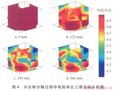 圖8是水合物分解過程中電阻率比三維空間分布圖。如圖8所示,圖8-a為開采前的水合物電阻率比三維分布圖,此時(shí)所有測(cè)點(diǎn)的電阻率比均為初始值l。圖8-b為開采第l22分鐘的電阻率比三維分布圖,此時(shí)水合物開采處于降壓開采階段,可以看見水合物藏內(nèi)的水合物開始分解,并且分解主要集中于上層,這可能是由于開采井位于上層的原因。而圖8-c和圖8-d分別為第244分鐘和第366分鐘的電阻率比云圖,可發(fā)現(xiàn)水合物藏中的電阻率比持續(xù)下降,表明水合物持續(xù)分解。并且在第366分鐘(圖8-d)達(dá)到最低。