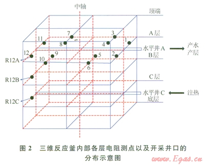 圖2繪出了三維反應(yīng)釜內(nèi)部各層電阻率測(cè)點(diǎn)以及開采井口的分布示意圖。從圖2中可以看出,共有l2×3個(gè)電阻測(cè)點(diǎn)以及分別位于A、C兩層的中心水平井。本實(shí)驗(yàn)中,反應(yīng)釜注熱井為底層水平C井,出口為與注熱井在同一垂直截面上的頂層水平A井。實(shí)驗(yàn)中,壓力由Trafag制造的NAT8251.7425型壓力傳感器測(cè)量,測(cè)量范圍為0~25MPa,精度為±0.02MPa。溫度由Ptl00鉑電阻測(cè)量,測(cè)量范圍為-20~200℃,精度為±0.1℃。蒸餾水由平流泵注入,通過中間容器,經(jīng)過加熱罐后被加熱為高溫蒸汽進(jìn)入釜內(nèi)。平流泵為北京創(chuàng)新通恒有限公司制造的P3000型,流量范圍為0~50mL/min,精度為±0.001mL/min,壓力范圍為0~25MPa。加熱罐由南通飛宇有限公司制造,可加熱水至30~190℃,精度為±0.1℃。供氣部分包括甲烷氣瓶、壓力調(diào)節(jié)閥、穩(wěn)壓器、氣體流量計(jì)等,氣體流量計(jì)采用北京七星D07型質(zhì)量流量控制器,量程為0~10L/min,測(cè)量精度為l%。’實(shí)驗(yàn)所用氣體為99.9%的純甲烷氣體,由佛山華特氣體有限公司提供。