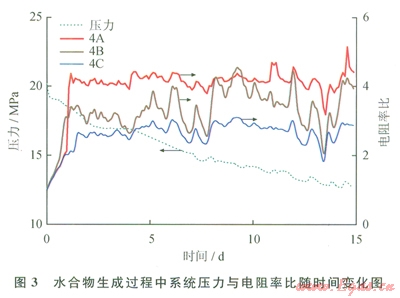 在本項(xiàng)研究中,甲烷水合物生成過程歷時(shí)約15天,在此過程中反應(yīng)釜系統(tǒng)壓力由20MPa下降至12MPa。由于本工作所用電極對(duì)的電阻探頭在反應(yīng)釜中間距不一致,在這里,筆者同樣利用實(shí)驗(yàn)過程中實(shí)時(shí)的電阻率值與實(shí)驗(yàn)開始前的電阻率的比值作為比較的參數(shù)。圖3是在水合物生成過程中系統(tǒng)壓力與電阻率比隨時(shí)間變化圖。圖3中以4A、4B和4C作為參考點(diǎn),研究生成過程中A、B、C 3層的電阻率變化區(qū)別。如圖3所示,在甲烷水合物生成的第一和第二天電阻率值同時(shí)快速升高,表明在位于4A、4B、4C處的水合物迅速生成。然而在水合物生成的余下約l3天的時(shí)間中,系統(tǒng)壓力持續(xù)下降,表明反應(yīng)釜中的水合物在持續(xù)生成,但是電阻率并沒有明顯上升趨勢(shì)。這有可能是由于位于4A、4B、4C測(cè)點(diǎn)處水合物在前兩天的牛成中已經(jīng)達(dá)到飽和狀態(tài),電阻率無法再升高,而水合物在其他地區(qū)繼續(xù)生成。說明水合物在反應(yīng)釜內(nèi)各點(diǎn)的生成并不是同步的。