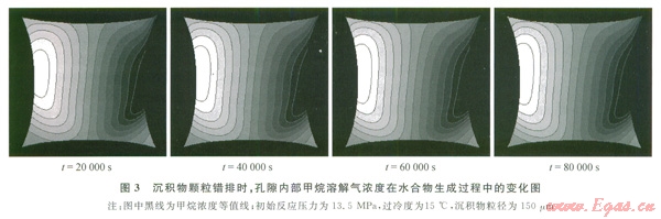 2)介觀尺度模型主要研究的是沉積物顆粒組成的孔隙,以孔隙水中溶解氣體的濃度為變量,模擬了由沉積物顆粒組成的單個(gè)孔隙內(nèi)水合物的生成過(guò)程。結(jié)果表明,在沉積物顆粒體系內(nèi)部,孔隙面相對(duì)比較平整,水合物先在沉積物壁面生成,而后沿著壁面法線方向增長(zhǎng),水合物在生成過(guò)程中呈層狀生成,最后在孔隙中間會(huì)合,從而充滿整個(gè)沉積物孔隙。