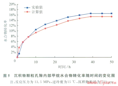 為了驗(yàn)證模擬結(jié)果的可靠性,將模擬結(jié)果與實(shí)驗(yàn)結(jié)果進(jìn)行對(duì)比,如圖5、6所示。實(shí)驗(yàn)得到的甲烷水合物和二氧化碳水合物的轉(zhuǎn)化率均大于模擬結(jié)果。這主要由以下幾個(gè)因素造成。