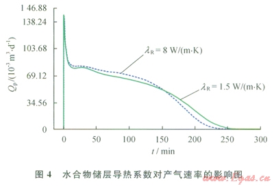 導(dǎo)熱系數(shù)是指水合物儲層傳播熱量的能力。水合物分解是一個吸熱過程,對于水合物地層,若其導(dǎo)熱系數(shù)大,則在單位時間多孔介質(zhì)中有更多的熱量傳遞到水合物分解前緣,對水合物分解有更好的促進作用。圖4顯示了地層導(dǎo)熱系數(shù)(lR)分別為1.5 W/(m·K)和8W/(m·K)條件下水合物藏產(chǎn)氣速率隨時間變化的關(guān)系[28]。可以發(fā)現(xiàn),在其他參數(shù)相同的條件下,在開采的前期,隨著地層導(dǎo)熱系數(shù)的增加,水合物產(chǎn)氣速率增加;開采后期隨著地層導(dǎo)熱系數(shù)的增加,水合物產(chǎn)氣速率反而減小,但導(dǎo)熱系數(shù)對水合物藏產(chǎn)氣速率的總體影響很小。