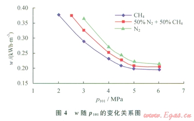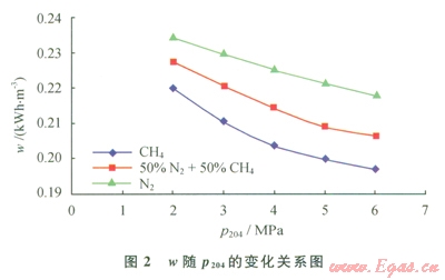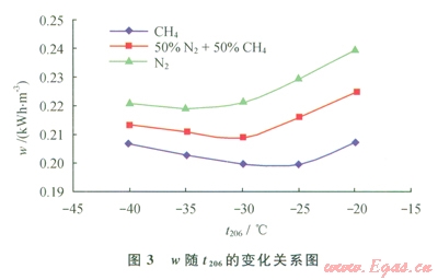 當(dāng)進(jìn)口天然氣壓力(P101)為5MPa、LNG儲存壓力(P104)為2MPa、氣體制冷劑膨脹前壓力(P204)為5MPa時,在一定范圍內(nèi)改變氣體制冷劑膨脹前預(yù)冷溫度(t206),通過HYSYS軟件模擬計算可得到產(chǎn)品LNG的單位能耗(w),進(jìn)而得到w隨t206的變化關(guān)系(圖3)。由圖3可知,產(chǎn)品LNG單位能耗先隨制冷劑膨脹前預(yù)冷溫度的增加而降低,后又隨之增加而增加。這是因為膨脹前溫度較低時,流程的熱負(fù)荷較大,造成制冷劑流量上升,壓縮機功耗隨之增加,從而導(dǎo)致產(chǎn)品LNG能耗增加。膨脹前溫度較高時,膨脹后的溫度也較高,引起膨脹后壓力自調(diào)節(jié)降低壓力,壓縮機功耗隨之增加,從而導(dǎo)致產(chǎn)品LNG能耗增加。故而制冷劑存在一個最優(yōu)膨脹前壓力,南圖3可知,t206為-25℃、-30℃、-35℃時分別是CH4、50%N2+50%CH4、N2制冷劑的最優(yōu)膨脹前預(yù)冷溫度。