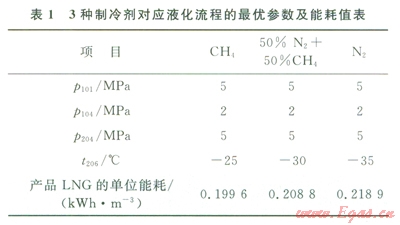 通??紤]到安全因素,N2是首選的膨脹制冷劑,為降低能耗,N2-CH4混合物也常被用作制冷劑[7]。通過上述對CH4、50%N2+50%CH4和N2這3種制冷劑的研究,可得到3種對應(yīng)液化流程的最優(yōu)參數(shù)及能耗值(表1)。由表l可知,CH4、50%N2+50%CH4和N2這3種制冷劑膨脹前預(yù)冷溫度的最優(yōu)值依次降低,這是由于N2的液化溫度低于CH4的液化溫度而造成的。由圖5及表l不難發(fā)現(xiàn)這3種制冷劑中N2的能耗最高,CH4的能耗最低,這是因為進(jìn)口天然氣的比熱容隨溫度變化的性質(zhì)與CH4制冷劑的比熱容隨溫度變化的性質(zhì)十分接近[11],使得天然氣與制冷劑換熱時的平均溫差較小,炯損失較小,能耗也較低。