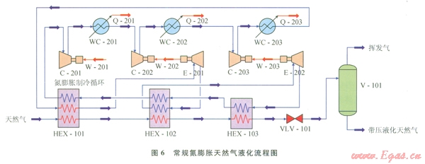 HYSYS模擬的常規(guī)氮膨脹天然氣液化流程如圖6所示[12]。經(jīng)過預(yù)處理后的進(jìn)口天然氣通過換熱器HEX-l01和HEX-l02降溫,然后節(jié)流至l01kPa變?yōu)?span lang="EN-US">LNG,送入儲罐V-101。液化流程所需冷量由氮膨脹制冷循環(huán)提供,由于常規(guī)液化流程所需的低溫更低,若采用單級膨脹會導(dǎo)致膨脹機的膨脹比非常大,故而一般采用兩級膨脹為流程提供冷量和所需的低溫。氮氣制冷劑首先經(jīng)過三級壓縮水冷器,再進(jìn)入膨脹機E-201膨脹降溫,接著進(jìn)入換熱器HEX-102為其提供冷量,然后進(jìn)入膨脹機E-202繼續(xù)膨脹降溫,接著依次通過三級換熱器為其提供冷量,最后復(fù)溫回到壓縮機。其中膨脹機E-201和E-202產(chǎn)生的膨脹功分別由壓縮機C-202和C-203完全回收利用,構(gòu)成兩個壓縮膨脹機組。由于常規(guī)天然氣液化流程的進(jìn)口天然氣要經(jīng)過CO2預(yù)處理,CO2的含量一般不超過0.01%。因此,這里仍舊取99.99%CH4+0.01%CO2作為進(jìn)口原料氣。