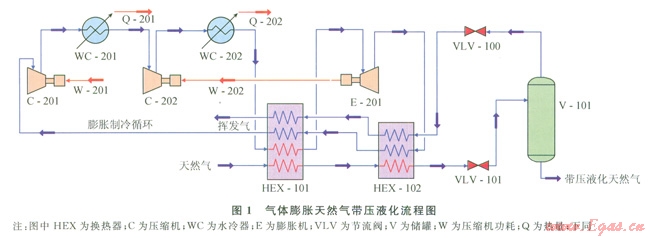 針對CO2含量較低的海上天然氣沒計了一種氣體膨脹帶壓液化流程(圖1)。為簡化研究,筆者省略了天然氣脫H2S、脫重?zé)N、脫水等凈化處理過程。將凈化后帶有一定壓力的天然氣引入換熱器HEX-l01和HEX-l02降溫后節(jié)流至l~2MPa,變成液化產(chǎn)品LNG后引入儲罐V-101儲存。儲罐中的揮發(fā)氣(BOG)節(jié)流降溫后返同到換熱器,以回收部分低溫能和壓力能。整個液化流程由氣體膨脹制冷循環(huán)提供冷量,氣體制冷劑經(jīng)過兩級壓縮中間水冷后,再經(jīng)過換熱器HEX-l01預(yù)冷,然后經(jīng)過膨脹機膨脹降至低溫,依次為換熱器HEX-101和HEX-l02提供冷量,復(fù)溫后回到壓縮機。其中壓縮機C-202和膨脹機E-201共同構(gòu)成壓縮膨脹機組,膨脹機E-201產(chǎn)生的膨脹功剛好完全回收給壓縮機C-202使用。