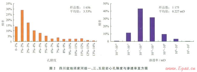 根據(jù)須一、須三、須五段37口氣井試油分析,測(cè)試井段巖性主要為砂巖,以厚層砂巖為主,少數(shù)井為多套薄層砂巖,產(chǎn)層段大多發(fā)育裂縫。眾所周知,單層厚層砂巖較薄層砂巖具有更好的儲(chǔ)集性,因?yàn)楹駥由皫r沉積時(shí)水動(dòng)力較強(qiáng),儲(chǔ)集窄間連通性較好,孔隙度較高,薄層砂巖沉積時(shí)由于水動(dòng)力較弱,砂巖雜基發(fā)育,儲(chǔ)層物性較差。而對(duì)于多套薄互層砂泥巖發(fā)育段,雖然單層砂巖厚度較薄,儲(chǔ)集性較差,但多套薄層砂巖段極有可能形成一定的儲(chǔ)集空間,因?yàn)閷?duì)于多套薄砂泥巖段,其砂巖與泥質(zhì)烴源接觸面積多倍于單層厚砂巖與烴源接觸面積,其油氣聚集效率可能更高。例如:在烴源巖單位體積生排烴條件相同的條件下,5套薄層砂巖與其累計(jì)厚度相當(dāng)?shù)?span lang="EN-US">l層厚層砂巖,理論上,油氣聚集效率前者是后者的5倍;再者,薄層砂巖由于抗壓能力弱,在外力相同的條件下,其裂縫發(fā)育程度比厚層砂巖高,更有利于改善砂巖的滲透性。因此,勘探厚層砂巖的同時(shí),須一、須三、須五段,“泛發(fā)育的多套薄層砂巖也不能忽視。