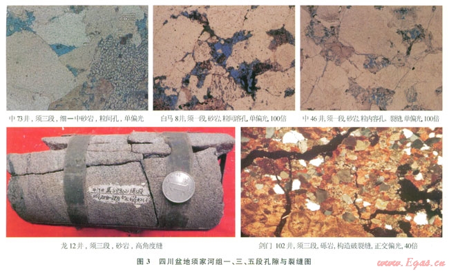 須三段儲(chǔ)集巖有砂巖、礫巖2種類型。砂巖儲(chǔ)層幾乎在全盆地均有分布,儲(chǔ)層孔隙度平均為4.43%,平均滲透率為0.25mD。以中壩地區(qū)物性最好,儲(chǔ)集巖主要為中粒巖屑石英砂巖、長(zhǎng)石石英砂巖及巖屑砂巖,巖心平均孔隙度達(dá)7.52%,平均滲透率為0.3mD,粒間溶孔和粒內(nèi)溶孔發(fā)育。礫巖儲(chǔ)層僅分布在川西北劍閣地區(qū),礫石成分以碳酸鹽巖為主,礫間充填砂質(zhì),孔隙主要發(fā)育于基質(zhì)砂巖,孔隙度較低,主要分布在2%~4%。巖心與薄片觀察,裂縫發(fā)育,有時(shí)呈組出現(xiàn)或呈網(wǎng)狀,發(fā)育的裂縫溝通了低孔隙度礫巖儲(chǔ)層,改善了儲(chǔ)層的滲透性,孔隙與裂縫組成礫巖儲(chǔ)層儲(chǔ)集空間,形成“有效儲(chǔ)滲體” [15]。目前該區(qū)勘探發(fā)現(xiàn)多口工業(yè)氣井,表明孔隙度為2%~4%的砂礫巖,只要有裂縫的溝通,仍然可以形成有效儲(chǔ)層。平面上,儲(chǔ)層主要分布在川西地區(qū),以川西北劍閣—中壩地區(qū)最為發(fā)育,儲(chǔ)層厚度超過15m。