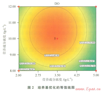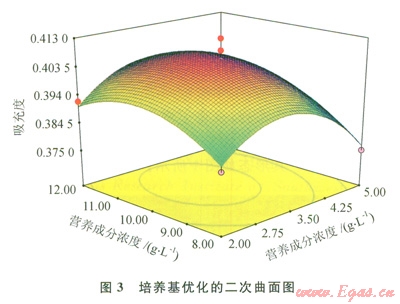 利用計(jì)算機(jī)輔助設(shè)汁,采用表面響應(yīng)法快速篩選微生物能夠利用的營(yíng)養(yǎng)成分,確定脫硫微生物的所需的營(yíng)養(yǎng)物種類;采用中心組合設(shè)計(jì)方法優(yōu)化培養(yǎng)基中主要化學(xué)品的組成(圖2、3)。利用Design Expert軟件篩選顯著變量,建立回歸方程,由回歸方程對(duì)菌種生長(zhǎng)能力進(jìn)行預(yù)測(cè),并得到最優(yōu)培養(yǎng)基組成。同時(shí)應(yīng)用單因素實(shí)驗(yàn)篩選生長(zhǎng)因子及微量元素,形成了完整的培養(yǎng)基配方。