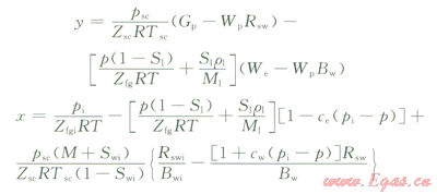 注意到x和y均為壓力的函數(shù),不同壓力下的數(shù)據(jù)點(diǎn)在y—x坐標(biāo)圖中應(yīng)位于同一直線上,直線的斜率即原始烴類孔隙體積。計(jì)算過程中可采用試算法確定部分未知項(xiàng)。包含自由氣與水溶氣的總儲(chǔ)量為: