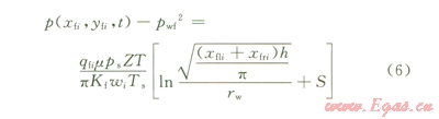 第i條裂縫就可以看成是一個以流動半徑為Ri,厚度為裂縫寬度wi,邊界壓力為裂縫尖端壓力p(xfi,yfi,t),滲透率為Kf,流壓pwf的微型氣藏,其流動方式可以看成徑向流,所以氣體在裂縫內(nèi)的流動過程可表示為: