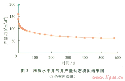 某氣藏壓裂層有效藏厚度8m,地層滲透率為10mD,地層溫度80℃,井筒半徑0.1m,水平井段長度400m;原始地層壓力27.56MPa,井底流壓為23.56MPa;氣體黏度為0.022mPa·S,氣體壓縮因子為0.957。壓裂形成5條橫向裂縫,各條裂縫長度200m,裂縫滲透率50D,支撐裂縫寬度0.003m。模擬計算結(jié)果如圖2、3所示。