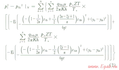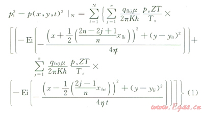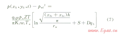 式中pi為原始地層壓力,Pa;p(x,y,t)為地層中點(x,y)在t時刻的壓力,Pa;qflij為第i條裂縫左端第j段的產(chǎn)量,m3/s;xfli、xfri分別為第i條裂縫左、右翼的長度,m;ps為地面標況下的壓力,Pa;Z為偏差因子;m為氣體黏度,Pa·S;K為地層滲透率,m2;h為產(chǎn)層厚度,m;t為滲流時間,s;T為地層溫度,K;ts為地面標準溫度,K;h為導(dǎo)壓系數(shù);yfi為第i條裂縫y方向坐標。
