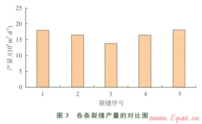 由圖3可以看出:水平氣井端部裂縫(1號和5號裂縫)的產(chǎn)量最高,中部裂縫(2號和4號裂縫)產(chǎn)量其次,中心裂縫(3號裂縫)產(chǎn)量最低。這是由于多裂縫之間干擾相互疊加影響的結(jié)果,水平氣井端部裂縫受到的干擾最小,而中心裂縫受到的干擾最大。與不考慮高速紊流(非達西流動)時的產(chǎn)量變化規(guī)律相似。