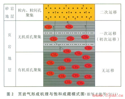 烴源巖排烴后烴類氣體(主要是甲烷)基本無運(yùn)移或頁(yè)巖層內(nèi)短距離運(yùn)移,屬于“自生自儲(chǔ)”,而常規(guī)天然氣要經(jīng)過二次運(yùn)移,從生氣層運(yùn)移到儲(chǔ)氣層(圈閉)中聚集成藏(圖2)。