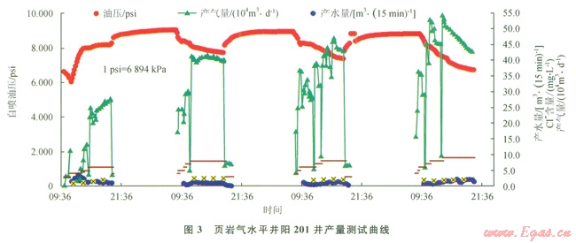 中國(guó)石油天然氣股份有限公司(以下簡(jiǎn)稱中國(guó)石油)已在四川的長(zhǎng)寧、威遠(yuǎn)、富順、永川,云南昭通等開展頁(yè)巖氣勘探開發(fā)。其中我國(guó)第一口頁(yè)巖氣水平井——威201-H1井于位于四川盆地南部,2011年2月完鉆,井深2835.6m,水平段長(zhǎng)1079m;分11段壓裂,加石英砂584.6m3,入地總液量23654m3,井下微地震監(jiān)測(cè)顯示,初步達(dá)到了規(guī)模體積壓裂的效果,目前日產(chǎn)氣量l3×104m3。中石油與殼牌合作區(qū)塊的水平井陽(yáng)201井,測(cè)試平均日產(chǎn)氣量為45.0×104m3,井口套壓48.3MPa,表現(xiàn)出良好的高產(chǎn)潛力(圖3)。