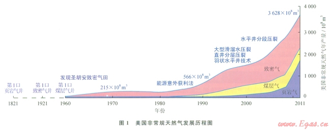 全球范圍內(nèi),常規(guī)油氣資源非常豐富,但非常規(guī)油氣資源更加豐富,據(jù)美國(guó)地質(zhì)調(diào)查局(USGS)和美國(guó)能源部能源信息署(EIA)2009年估計(jì),全球非常規(guī)石油(重油、天然氣瀝青和頁(yè)巖油等)可采資源量約為4495×108t,與常規(guī)石油資源基本相當(dāng);全球非常規(guī)天然氣(煤層氣、致密砂巖氣、頁(yè)巖氣和天然氣水合物等)可采資源量為4000×1012m3,是常規(guī)天然氣資源量的8倍左右。目前非常規(guī)油氣的開發(fā)利用技術(shù)日趨成熟,已成為常規(guī)石油天然氣最現(xiàn)實(shí)的接替資源。美國(guó)頁(yè)巖氣、致密氣、煤層氣、致密油,加拿大油砂油、煤層氣,巴西和墨西哥灣深海油氣、委內(nèi)瑞拉重油等的規(guī)模開發(fā),使兩半球非常規(guī)油氣產(chǎn)量快速增長(zhǎng)。2011年,全球非常規(guī)天然氣產(chǎn)量迅速上升到4000×108m3/a,非常規(guī)天然氣已經(jīng)成為一支不容忽視的能源新力量。美國(guó)是全球非常規(guī)天然氣開發(fā)利用的領(lǐng)軍國(guó)家,其非常規(guī)天然氣的勘探開發(fā)歷經(jīng)百年,規(guī)模開發(fā)探索了30年,近10年獲得了迅速發(fā)展(圖1),2011年非常規(guī)天然氣產(chǎn)量達(dá)3628×108m3,占其天然氣總產(chǎn)量的55.7%。