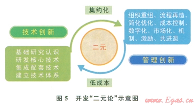 “二元論”是從我國(guó)鄂爾多斯盆地非常規(guī)油氣勘探開發(fā)實(shí)踐中總結(jié)形成的成功做法,是指在頁(yè)巖氣開發(fā)建設(shè)和技術(shù)攻關(guān)中,技術(shù)創(chuàng)新與管理創(chuàng)新相互結(jié)合,集中配置人力、物力、投資、組織等要素,通過集成與集約,以較低的成本實(shí)現(xiàn)開發(fā)目標(biāo)(圖5)。