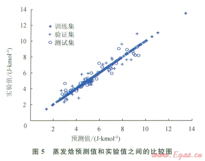 化合物的數(shù)目表明了方程式數(shù)目,而分子描述符的數(shù)目則表明了系數(shù)數(shù)目。因此,化合物數(shù)目超出分子描述符數(shù)目的比率越小,ANN就能在“訓(xùn)練”集中表現(xiàn)得越好。不過,對不在“訓(xùn)練”集內(nèi)的化合物來說,以這種方法構(gòu)建的ANN無法保證其預(yù)測水平。舉例來說(如表l所示),對于所構(gòu)建的蒸發(fā)焓或燃燒焓模型而言,“測試”集的平均相對誤差遠遠大于“訓(xùn)練”集的平均相對誤差。解決此問題的一個可能方案是采用PCA[8]:用PCA來處理描述符,然后找到得分,取前30列的得分(含上述信息99%的內(nèi)容),最后按照上述步驟構(gòu)建一個新的ANN。