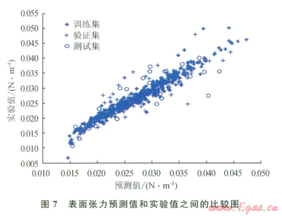 仔細研究所獲結(jié)果,可以發(fā)現(xiàn)“訓(xùn)練”集的相對誤差總是小于“驗證”集或“測試”集的相對誤差,這主要是因為“驗證”集或“測試”集對ANN的訓(xùn)練方式?jīng)]有直接影響。因此,對人工神經(jīng)網(wǎng)絡(luò)進行了修正,使其更適合于“訓(xùn)練”集的數(shù)據(jù)??梢园延?xùn)練過程想象為找出方程組的待定系數(shù)。