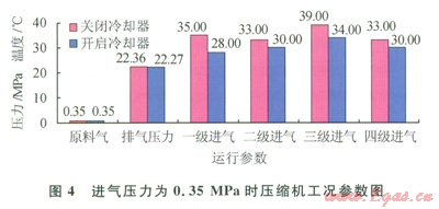 從表2的數(shù)據(jù)可看出,當(dāng)進氣壓力為0.35 MPa時開啟冷卻器后壓縮機一級進氣溫度由35℃降低到28℃,溫度下降了7℃,其他參數(shù)對比分析如圖4所示。總之,在不同進氣壓力下,開啟冷卻器后壓縮機各級進氣溫度都有所下降,對第二、四級級間回氣的冷卻取得了降低壓縮機進氣溫度的效果。