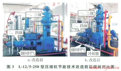 基于上述的節(jié)能技術(shù)原理,由于現(xiàn)場條件的限制,本次改造僅僅在L-12/5-250型壓縮機第二、四級級間回氣管線上加裝了一套冷卻器,冷卻器換熱面積為1.5,改造前后現(xiàn)場如圖3所示。為了系統(tǒng)分析節(jié)能改造的節(jié)能效果,在不改變冷卻系統(tǒng)和壓縮機系統(tǒng)其他設(shè)備參數(shù)的條件下,通過系統(tǒng)原有壓力、溫度、氣量、電耗等記錄儀表,分別測試了原料氣進氣壓力為0.35、0.38、0.40MPa下關(guān)閉和開啟冷卻器時壓縮機的運行參數(shù)和能耗,相關(guān)數(shù)據(jù)見表1、2。