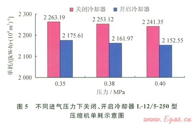 節(jié)能考核指標(biāo)為壓縮機壓縮單位體積的天然氣所需的能耗,即單耗。通過以上能耗數(shù)據(jù)對比分析得出關(guān)閉和開啟冷卻器時壓縮機組在不同進氣壓力下的單耗,分析該節(jié)能技術(shù)的節(jié)能效果。在原料氣進氣壓力為0.35、0.38、0.40MPa時,分別取得了節(jié)能比為3.87%、4.04%、3.96%的節(jié)能效果。相關(guān)工況的節(jié)能效果分析結(jié)果見表3,改造前后壓縮機單耗對比分析如圖5所示。