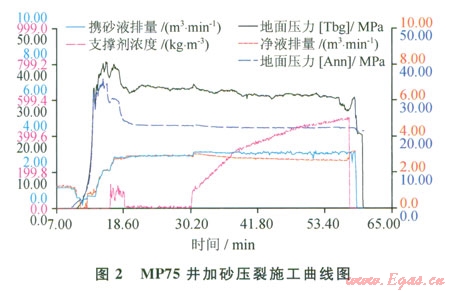 對MP75井進(jìn)行了纖維網(wǎng)絡(luò)攜砂+低稠化劑濃度+全程液氮伴注現(xiàn)場試驗(yàn),施工按照設(shè)計(jì)泵注程序進(jìn)行,地層破裂后,緩慢提排量至2m3/min,此過程中開始泵入支撐劑段塞,監(jiān)測壓力和泵壓顯著下降,段塞入地后,監(jiān)測壓力下降了l2.8MPa,且趨于穩(wěn)定。然后以150m3/mim排量伴注液氮,加砂初期勻速加入纖維,施工排量為2.8~3.1m3/min,監(jiān)測壓力(22~23MPa)和泵壓(31~33MPa)平穩(wěn),按設(shè)計(jì)順利完成加砂壓裂,施工曲線見圖2。