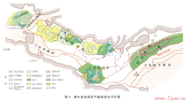 潮水盆地煤層氣成藏主控因素為“生物氣補給”“構(gòu)造系統(tǒng)”“頂板蓋層條件”,尋找煤層氣勘探有利區(qū)應(yīng)重點考慮這3個條件。 平山湖坳陷、阿右旗坳陷煤層發(fā)育較好,但煤系上覆地層因構(gòu)造抬升導(dǎo)致剝蝕嚴(yán)重,缺乏區(qū)域性蓋層,且煤層直接蓋層為砂巖,造成早期生成的氣大量散失。此外由于煤系地層水不活躍,S042-濃度過高,抑制了甲烷細(xì)菌的生存,使得后期缺乏生物氣的補充。