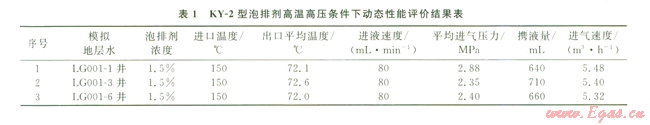 使用PP-1型高溫高壓泡沫評(píng)價(jià)裝置測(cè)定高溫高壓條件下KY-2泡排劑動(dòng)態(tài)性能,其測(cè)試結(jié)果見表1。實(shí)驗(yàn)數(shù)據(jù)表明在進(jìn)口溫度