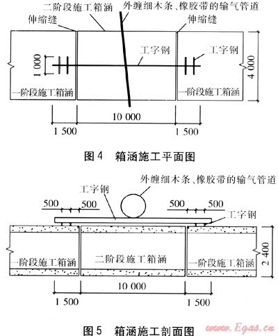 首先調(diào)整箱涵設計標高,使箱涵與輸氣管道垂直凈距不小于50cm,垂直方向保證足夠的安全距離和操作空間。再調(diào)整箱涵伸縮縫位置,使輸氣管道位于一節(jié)箱涵的中間。