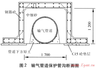 A號路為城市快速路,建設標準高,路面結構厚度約80cm,路基需要分層碾壓以滿足道路密實度要求??紤]到輸氣管道設計壓力高,環(huán)向應力大,為保證管道在道路施工及今后運行中的安全,我們對A號路車行道下的輸氣管道采用管溝保護(見圖2,圖中尺寸單位為mm,以下同)。管溝內(nèi)壁與輸氣管道之間凈距不小于50cm,采用現(xiàn)澆施工,兩端伸出道路邊緣2m,并要求施工中盡量保留輸氣管道周圍的原土,避免破壞管道防腐層。