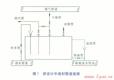 按原設計,煤氣輸送主管道上的附屬液封一期有6個(其余液封為設備專用液封)、二期有8個(其余液封為設備專用液封);每個液封都設有放散管、下液管、溢流管、排液管及蒸汽管等附屬管道,所有下液最后經(jīng)溢流管流至酚氰廢水管道匯合至污水處理站。原設計中液封管道連接見圖l。