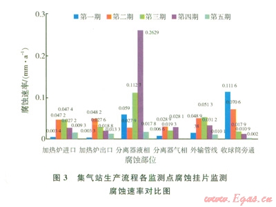 掛片腐蝕監(jiān)測數(shù)據(jù)發(fā)現(xiàn)腐蝕速率超過0.076mm/a的部位主要出現(xiàn)在分離器液相部位,主要原因為液相中成分復雜,腐蝕性成分及殘酸等大部分都存在于此,故該處腐蝕相對嚴重。