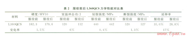 從服役前后管材的力學性能對比來看(表2),管材韌性略有下降、強度略有上升,延伸率相對變化較明顯,但下降不顯著,說明管材的力學性能保持良好。從沖擊試樣和拉伸試樣的斷口來看,均出現(xiàn)明顯韌窩,沒有脆性斷裂的特征。結(jié)合固溶氫含量的測量結(jié)果,可以判斷,盡管高含硫工況導致管材內(nèi)固溶部分氫,但遠未達到損傷管體強韌性的程度,管材可以安全服役。