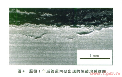 取樣結(jié)果顯示,管材內(nèi)表面無SSC裂紋,僅有少量氫鼓泡,管壁內(nèi)部無氫致開裂裂紋(圖4),也就是說在高含硫工況下環(huán)境開裂問題不嚴重,管材服役性能良好。