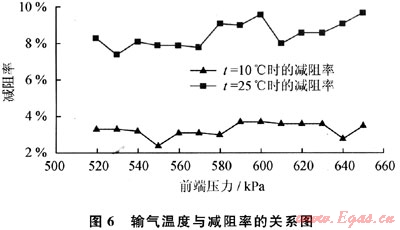 由于PASMT成膜劑和協(xié)同成膜助劑都是吸附成膜型有機化合物,而溫度對吸附的影響往往十分顯著,為了考察輸氣溫度對減阻率的影響,調(diào)整輸氣溫度為10℃時,其他條件與3號樣品測試時完全相同,減阻率測試結(jié)果如圖6所示。