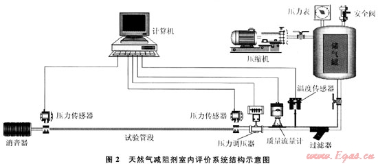 由于目前國內(nèi)天然氣減阻劑的研究尚處于實驗階段,還沒有建立起天然氣減阻劑減阻性能評價標準。參照現(xiàn)有“原油減阻劑減阻性能評價系統(tǒng)”,與中國石油管道科技研究中心合作設(shè)計制作了國內(nèi)首個天然氣減阻劑室內(nèi)評價系統(tǒng),其結(jié)構(gòu)示意圖如圖2所示[6]。