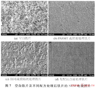 圖7分別為空白鐵片、PASMT成膜劑單獨處理鐵片、協(xié)同成膜助劑單獨處理鐵片、PASMT成膜劑和協(xié)同成膜助劑復(fù)配混合溶液處理鐵片的SEM電鏡照片。