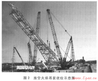 2009年6月16日和6月19日,采用整體滑移法分別完成了第1、2座放空火炬的吊裝,每座放空火炬的吊裝僅用了約50min,安全、順利、快捷,而且吊耳梁沒有任何變形。放空火炬吊裝就位示意圖如圖2所示。若采用分段吊裝、空中組對方案,不僅需要搭設高空組裝平臺,安全風險大,進度慢,而且要進行2次400t履帶吊車塔式工況組裝和1次塔式工況拆除,至少需要11d時間,分段吊裝每座放空火炬又至少需要2d時間,此外,因占用400t吊車時間長,還會影響其他大型設備吊裝作業(yè),延緩工程施工工期。因此,采用分解吊點受力法整體吊裝放空火炬,不僅提前13d完成放空火炬吊裝任務,節(jié)省400t履帶吊車租用費36萬元,加快了整個工程大型設備吊裝進度,特別是在施工現(xiàn)場緊缺吊耳梁材料的情況下,采用分解吊點受力的方法,成功解決了吊耳梁強度不足的難題,實現(xiàn)了吊耳梁以小代大的嘗試,圓滿完成了大型放空火炬吊裝任務,在吊裝技術(shù)上是一種創(chuàng)新。