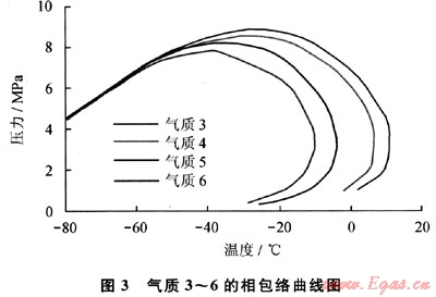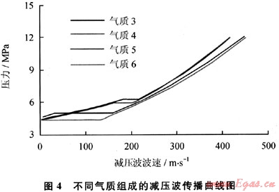 圖3為氣質(zhì)3~6的相包絡(luò)曲線圖,由表2和圖3可知,從氣質(zhì)3到氣質(zhì)6,氣質(zhì)組成逐漸變“輕”,其相包絡(luò)曲線的氣液兩相區(qū)域逐漸變小。圖4為不同氣質(zhì)組成的減壓波傳播曲線,初始?jí)毫?2MPa,溫度為30℃。由圖4可知,各曲線出現(xiàn)“平臺(tái)”的壓力逐漸降低,“平臺(tái)”位置下降。由此可以推測(cè),若氣質(zhì)組成中重組分含量減少至某程度時(shí),減壓波曲線中的平臺(tái)將消失,變?yōu)橐粭l光滑的曲線。也就是說(shuō),隨著重組分含量的增加,減壓波曲線容易進(jìn)入兩相區(qū),壓力保持在高位不能迅速下降,增大了管道裂紋擴(kuò)展的風(fēng)險(xiǎn)。